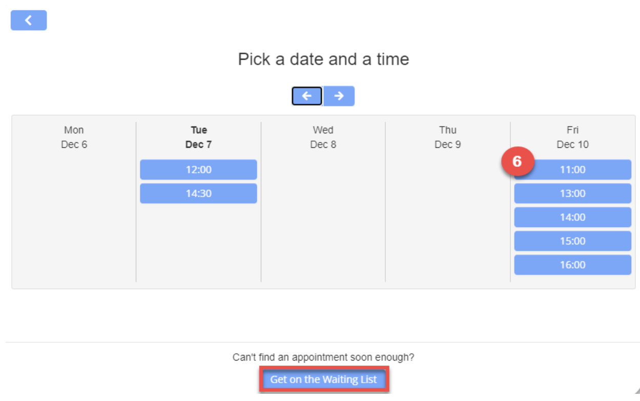 6. Navigate between weeks and choose the hour you would like to book. Choose ‘Waiting List’ if there aren't any availabilities matching yours.